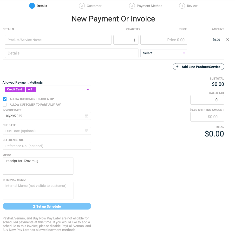 From the Stax Pay Dashboard, click Invoices, then, in the top-right corner, click Create Invoice.